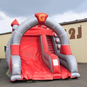 Toboggan gonflable avec arche médiéval, créneaux et descente de 3m