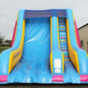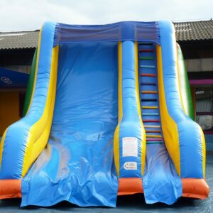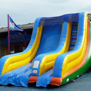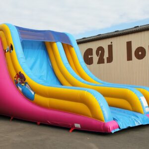 Le toboggan tout schuss est un toboggan conçus pour plus de sensations. Nous avons séparé la partie grimpette de la partie glisse par un mur gonflé, ce qui empêche les enfants qui montent de rencontrer ceux qui glissent. Pour monter en haut du toboggan nous avons cousu des marches en mousse. La plateforme de départ du toboggan est à une hauteur de 4m du sol. Les enfants glissent sur une pente de 65°. A la fin de la glisse la hauteur de matelas est moins épaisse pour que les enfants ne se fassent pas mal.