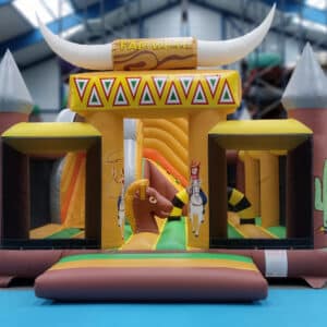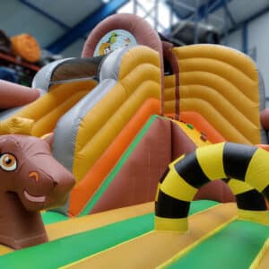 Complexe gonflable avec des obstacles sur la jungle et un toboggan