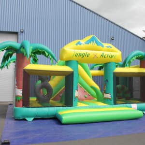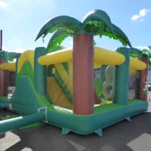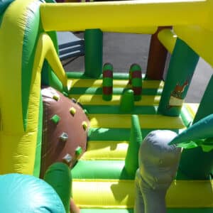 Matelas gonflable multi jeux avec obstacles et toboggan deco jungle