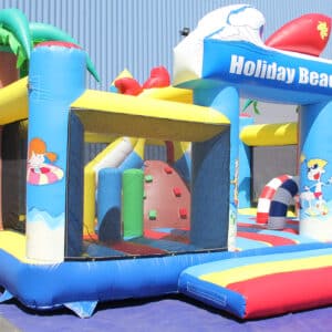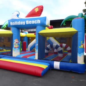 Complexe avec obstacles gonflé et toboggan déco palmiers/plage