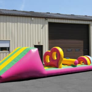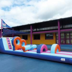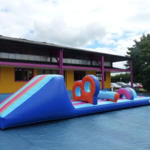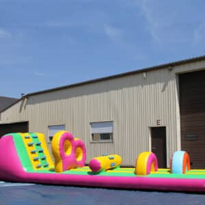 Le parcours piscine est un jeu gonflable à installer en bassin. Le bord du matelas doit être collé contre un bord de votre piscine. Les enfants n’ont plus qu’à traverser les différents obstacles jusqu’à la grimpette (marche en mousse antidérapante) pour finir dans l’eau par la descente du toboggan. Il faut bien faire attention de laisser 3m de chaque côté du jeu pour que les enfants ne puissent pas rencontrer d’obstacles en dur. L’Aqua Fun obstacles est composé de deux ponts, d’un petit tonneau , d’un mur à deux trous et d’un toboggan. Le jeu fait une longueur de 10m et la plateforme du toboggan est de 2m.