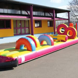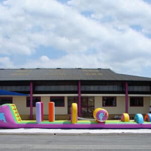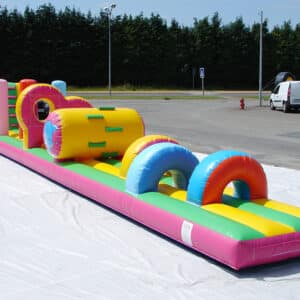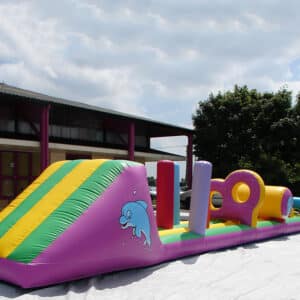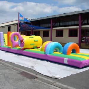 Le parcours piscine est un jeu gonflable à installer sur l’eau. Le bord du matelas doit être collé contre un bord de votre piscine. Les enfants n’ont plus qu’à traverser les différents obstacles jusqu’à la grimpette (marche en mousse avec toile antidérapante) pour finir par le toboggan, dans l’eau. Il faut bien faire attention de laisser 3m de chaque côté du jeu pour que les enfants ne puissent pas rencontrer d’obstacles en dur. L’Aqua Fun obstacles est composé de 3 ponts, d’un tonneau (avec des marches en mousse), d’un mur à 2 trous, de quelques punching-balls et d’un toboggan. Le jeu fait une longueur de 15m et la plateforme du toboggan est de 2m.