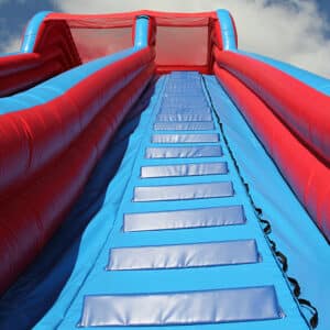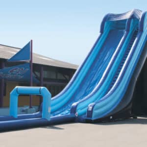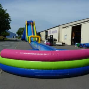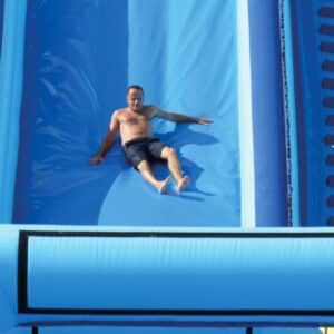 La piste aquatique 850 avec glisse sur bâche est composé de 3 modules. Le jeu commence par une grimpette avec marches en mousse couverte d’une toile antidérapante, la grimpette est séparée par un mur central, pour protéger les personnes qui glissent. Une fois en haut de la plateforme de 8.5m, il ne reste plus qu’à se lancer sur la pente de 45°. Arrivée en bas du toboggan la glisse se poursuit à l’horizontale pour arriver jusqu’à l’aire d’arrivée de Ø6.5m protégée par des murs de butée. Le toboggan aquatique est arrosé en haut du toboggan ainsi que sous les arches.