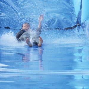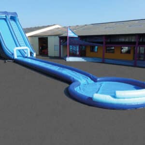 La piste aquatique est un toboggan de 11m de haut avec une plateforme de départ à 8.5m ainsi qu’un module de glisse avec une aire d’arrivée.