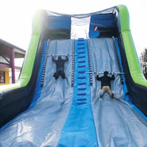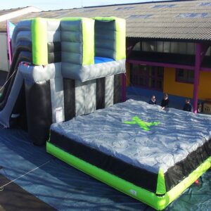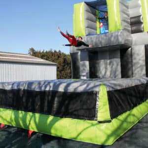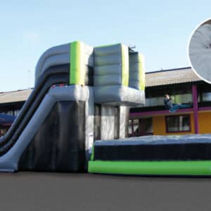 Le 1er module permet de pouvoir jouer au bras de fer (des crochets sont installés de chaque côté de la glisse) les joueurs montent la grimpette avec une barre alu à la force des bras), si on enlève les rangées de crochets le jeu devient tout simplement un toboggan gonflable “classique”. Tout en haut sur la plateforme il y a un petit passage pour accéder à la partie tremplin du jeu. Le joueur saute dune hauteur de 4m dans le soft tube (matelas de réception).