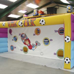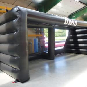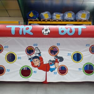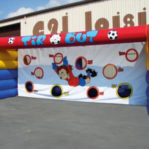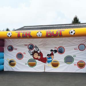 Le joueur se place devant la cage de foot et en faisait preuve de précision il doit tirer dans un trou, mais attention en fonction des emplacements les trous donnent plus ou moins de points. Le but est de faire le meilleur score de la partie. Le tir au but ou cage de foot est un jeu personnalisable, vous pouvez choisir vos couleurs, mais aussi opter pour un marquage de votre logo sur la toile de fond par exemple. Le but de foot pèse seulement 80kg, il est facile à mettre en place et à installer, brancher le gonfleur attendez quelques minutes, il est prêt à l’utilisation !
