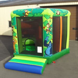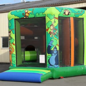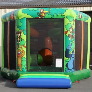 Ils peuvent bondir, rebondir sur le matelas, monter sur les obstacles. Les filets cousus tout autour du jeu et l’entrée dans le filet protègent les enfants d’éventuelles chutes. Avec sa décoration peinte à la main sur le thème jungle et ses couleurs vives, ce jeu trouvera sa place à côté d’autres gonflables.