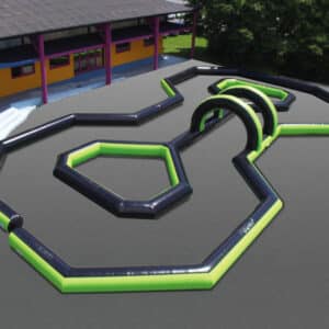 Les 2 grandes chicanes au centre du jeu apportent de la complexité au circuit, et du fun pour les utilisateurs. La petite entrée permet de contrôler le flux de personnes. Dans ce circuit 6 personnes peuvent jouer en même temps. Pour personnaliser votre circuit nous avons un large choix de couleurs. Pour la manutention le circuit est coupé en 3 morceaux conditionnés dans des sacs.