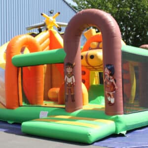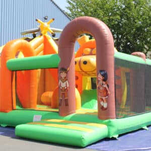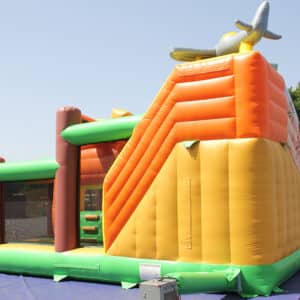 Complexe gonflable avec des obstacles sur la jungle et un toboggan
