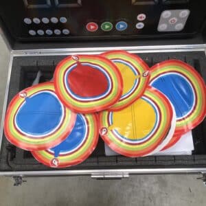 Doté de lumières, de sons et de plusieurs activités, vous pouvez ainsi proposer des jeux interactifs praticables à deux ou en équipe. Utilisable en intérieur comme en extérieur, ce système sans fil propose aux joueurs de frapper les spots à la main ou avec un ballon par ex. Le tableau d’affichage permet un suivi en direct des scores réalisés.