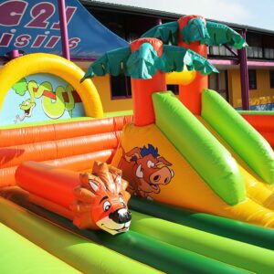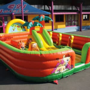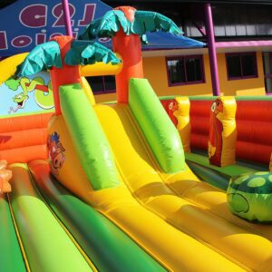 La corbeille est un jeu gonflable avec des obstacles ludiques et colorés spécialement conçue pour les plus jeunes. La hauteur du matelas a été rabaissée pour que les enfants puissent entrer et sortir sans tomber. A l’intérieur du jeu on trouve une grimpette avec des marches en mousse pour monter sur la plateforme du petit toboggan, ainsi que des petits obstacles pour éveiller leur curiosité et développer leur motricité.