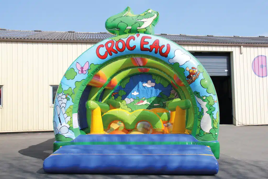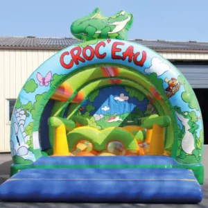 Le Splash sous 3 arches est un matelas à sauter avec 4 canons à eau, 1 pont avec une buse qui arrose les enfants quand ils passent dessous et une boule obstacle munie de jets d’eau. Ce jeu peut accueillir 25 enfants en même temps. Sur les côtés, on trouve les filets pour sécuriser l’aire de jeu, ils ont la particularité de laisser passer la lumière, ce qui permet de voir à travers, très pratique pour voir les enfants. Au fond est cousu une jolie toile tendue avec une déco Splash peinte à la main.