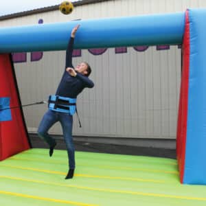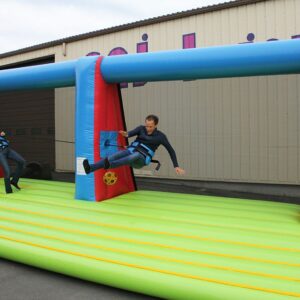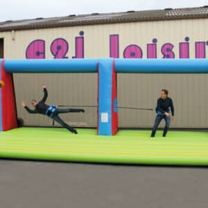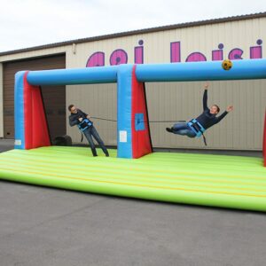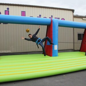 L’équa-foot est un nouveau concept que nous avons développé pour mixer le jeu du tir élastique avec le tir au but. 2 gardiens prennent place, 1 dans chaque but, ils sont attachés par une ceinture de tir élastiques. Un tireur se place devant le jeu, à l’aide d’un ballon en mousse il doit marquer des buts, tandis que les gardiens doivent arrêter les buts, mais c’est plus facile à dire qu’à faire quand l’autre gardien retient l’élastique. Les gardiens peuvent faire des plongeons sans aucun risque avec le matelas gonflable devant le jeu qui réceptionne les joueurs. Le jeu peut se jouer à partir de 8 ans.
