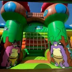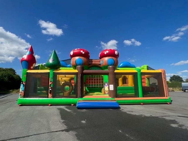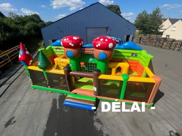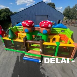 Jeu gonflable de fabrication française C2J vendu avec gonfleur, piquets et bâche de sol