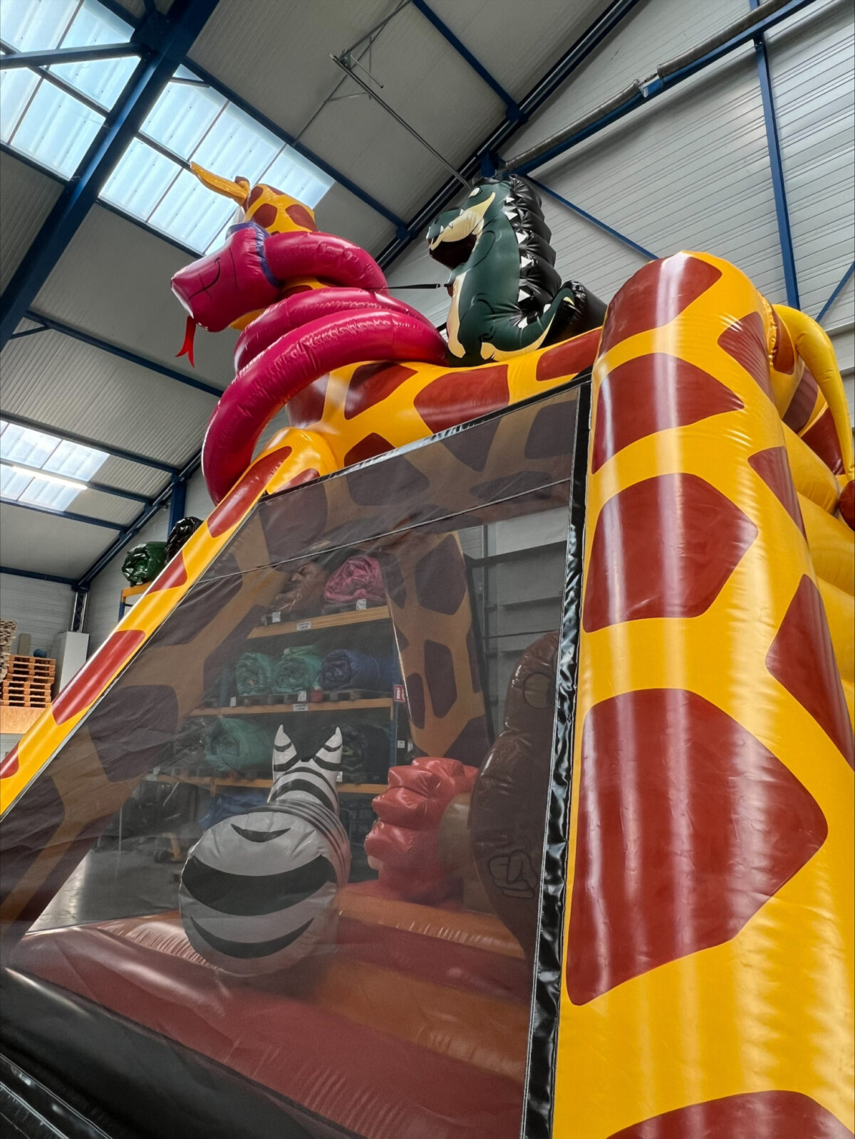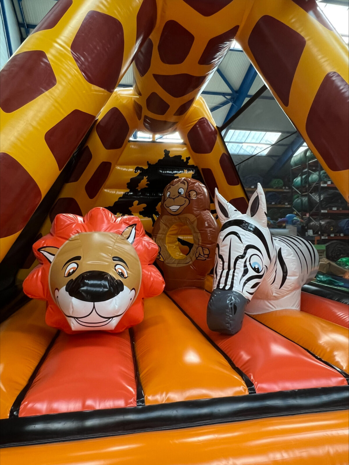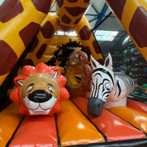À l’intérieur, les jeunes aventuriers retrouvent un véritable univers safari : un lion jovial, un zèbre amical, un singe joueur, le tous parfaitement intégrés comme obstacles ludiques pour sauter, se faufiler et s’amuser en toute sécurité.