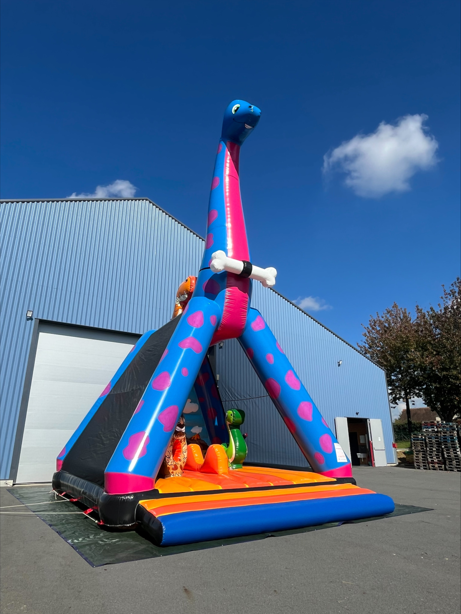 Plongez dans l’univers préhistorique avec ce spectaculaire jeu gonflable en forme de dinosaure ! Son immense structure colorée, dominée par un grand diplodocus bleu et ses amis dinosaures, attire tous les regards et promet des heures de fun pour les enfants.