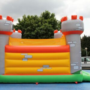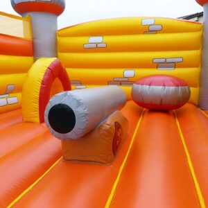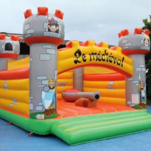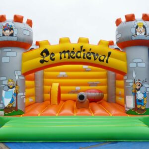 Le matelas gonflable médiéval est un matelas à sauter avec des obstacles qui peut accueillir 30 enfants en même temps. Avec ses dimensions de 7x6m les enfants ont une immense surface de jeu pour bondir, grimper sur les obstacles, faire des galipettes et sauter de boudin en boudin. Grâce aux murs sur les côtés et au fond les enfants jouent en toute sécurité. La grande surface de matelas nous a permis de mettre 3 obstacles : 1 canon, 1 boule et un pont. La grande entrée en façade permet aux parents de surveiller leurs enfants de loin. Les décorations sur les murs sur les poteaux et sur l’arche sont peinte à la main par des artistes peintres, elles sont ludiques colorées et personnalisables au moment de la fabrication.