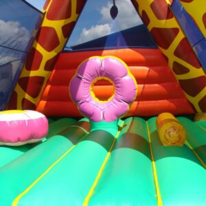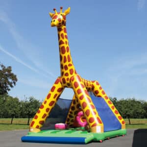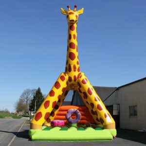 C2J en a fait sa mascotte depuis plus de 30 ans. La girafe gonflable est un jeu gonflable populaire. On le retrouve dans les campings, les parcs de jeux, les fêtes d’écoles. La girafe gonflable avec une taille de 7.5×6.5 m peut s’installer partout. A côté d’un toboggan ou d’un parcours c’est le jeu qui complétera votre offre. Avec ses obstacles ludiques et colorés, les enfants passent des heures à grimper sur la fleur, bondir sur le petit rondin de bois, sauter sur le matelas ou plonger la tête en avant dans la fleur à trous. Avec ses filets et son mur arrière les enfants jouent dans un endroit sécurisé. Sa grande ouverture en façade laisse aux parents la possibilité d’avoir toujours un œil sur ce qui se passe.