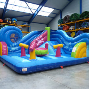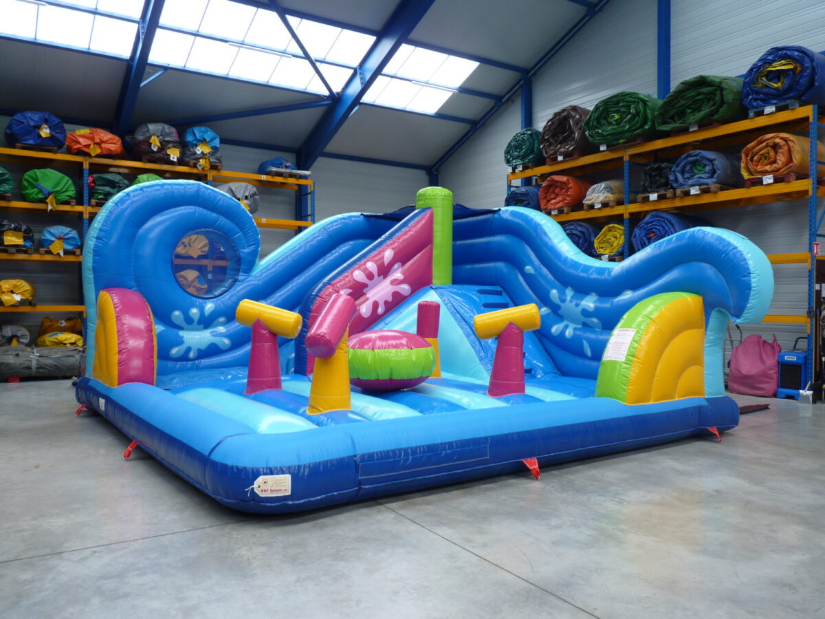 Conçu sur la base d’un matelas gonflable classique l’happy Splash est une aire de jeu aquatique avec des obstacles, une grimpette et un toboggan. Sur le matelas on trouve 4 canons à eau, ainsi que 1 boule d’où sortent des jets d’eau. Au fond du jeu la grimpette avec des marches en mousse recouvertes de toile antidérapante permet de monter sur la plateforme du toboggan qui est de 3m, ensuite il ne reste plus qu’à glisser sur la toile de glisse du toboggan arrosé grâce à des buses aquatiques. Pour protéger des glissades, nous avons recouvert les bords du matelas de toile antidérapante.
