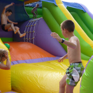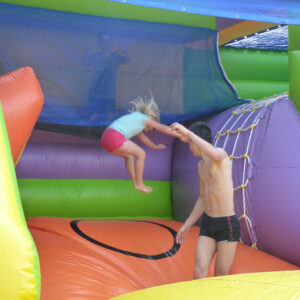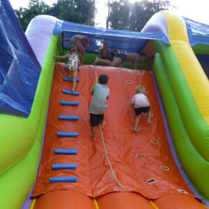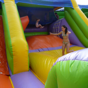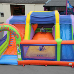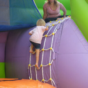 Le complexe Jump power est un jeu multi-activités. La particularité de ce jeu se trouve dans ses 2 dômes. Le jeu commence par une grimpette qui se compose de 3 parties : marches en mousse pour les plus petits, toile à trous pour plus de difficultés et une simple corde pour les plus téméraires. Une fois sur la plateforme les enfants peuvent choisir de sauter sur le dôme ou de passer par le pont de singe en filet pour aller directement glisser par le toboggan. Pour les intrépides, nous avons installé un cordage sur le flanc du toboggan pour pouvoir directement descendre celui ci. Avec ses grandes dimensions, il pourra accueillir jusquà 35 enfants.