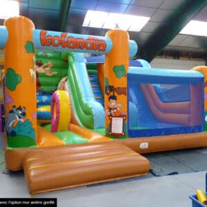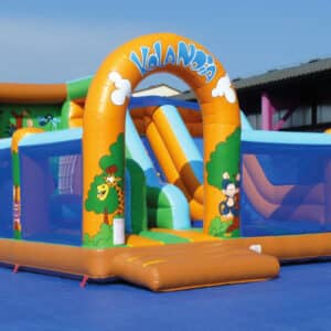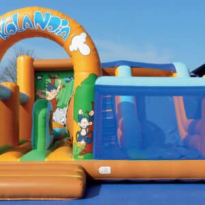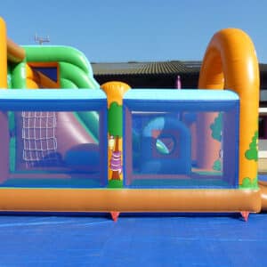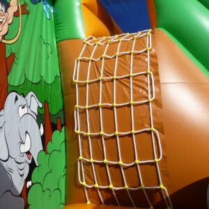 Le complexe Kolandia est un gonflable multi-activités. C’est un jeu sécurisé avec ses filets tout autour et sa bâche décorée à l’arrière. Les enfants peuvent sauter sur le matelas gonflable, jouer dans les obstacles, mais aussi grimper au cordage ou glisser sur le toboggan (plateforme du toboggan 2.6m de haut). Ce jeu est très populaire dans les parcs de jeux intérieur avec son faible encombrement et ses multiples activités.