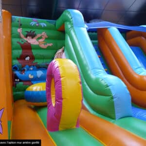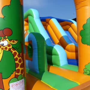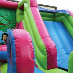 Ses décorations peintes à la main rendent ce jeu gonflable rigolo et sa grande arche d’entrée le rend unique.