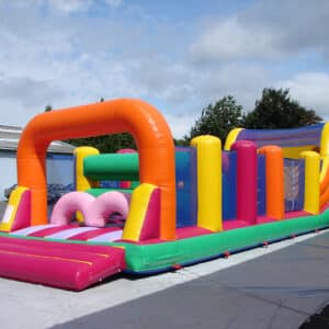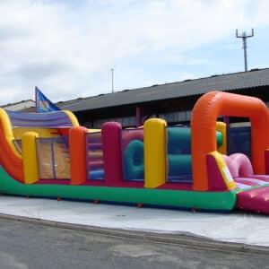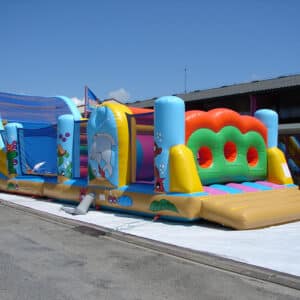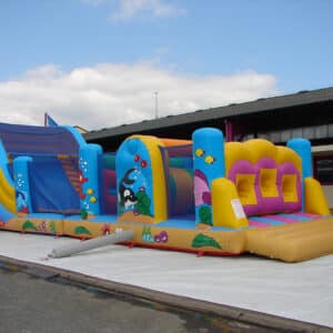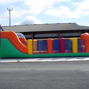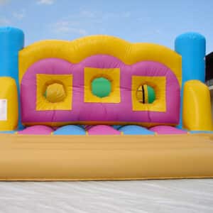 Pour protéger les joueurs nous avons cousu des filets de chaque côté du jeu. Si vous le souhaitez il est possible de peindre une décoration (en option) sur le jeu. La grande entrée en façade permet de voir les joueurs démarrer la course. Le toboggan d’une plateforme de 3m peut aussi amuser simplement les enfants avec des glissades et le matelas à sauter.