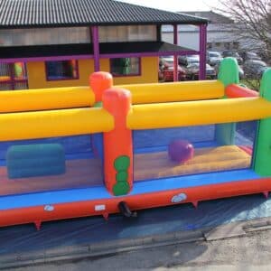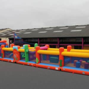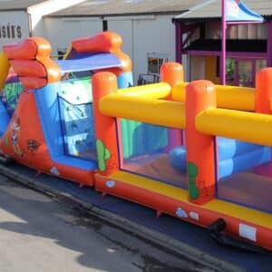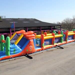 Long parcours gonflable avec toboggan, grimpette et obstacles