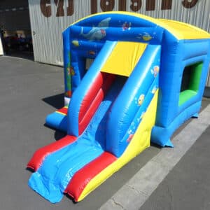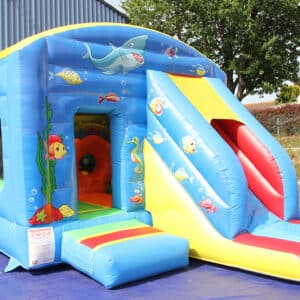 Gonflable avec un toit déco mer et un toboggan pour les enfants