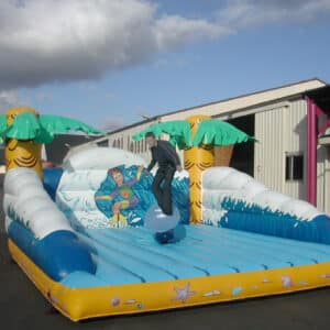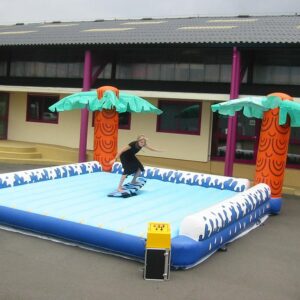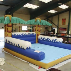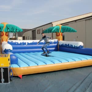L’animation est composée d’un matelas gonflable permettant de réceptionner les participants en cas de chute auquel il faudra associer une planche de surf sur  mécanique au milieu du matelas. Avec le joystick placé sur la console, l’animateur fait osciller la planche de surf de en haut en bas.