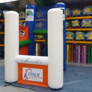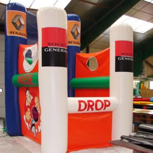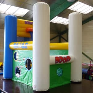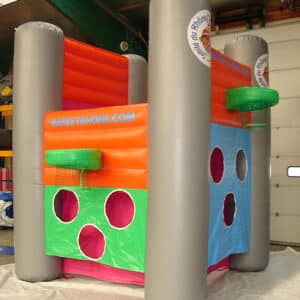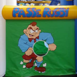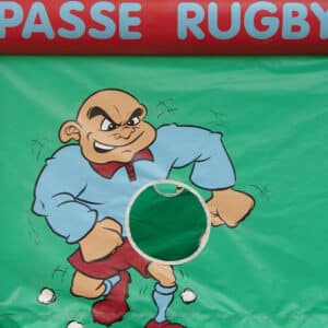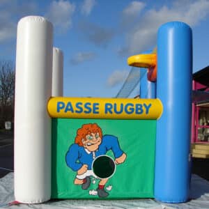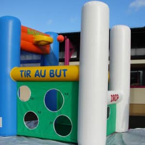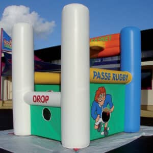 Le multi-shoot est un jeu conçu pour pouvoir jouer à plusieurs activités sans changer de jeu gonflable. La toile de tir au but cousu sur une des faces permet de jouer au football, en tirant dans les trous le joueur gagne plus ou moins de point en fonction du diamètre du trou. En prenant du recul avec un ballon de rugby l’utilisateur peut essayer de marquer des drops (le ballon doit passer entre les 2 poteaux blancs), ou s’il le souhaite s’entrainer à la passe latérale avec le trou passe rugby.