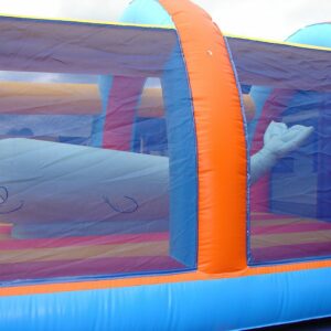Chateau gonflable avec filets tout autour et un obstacle baleine