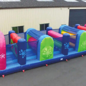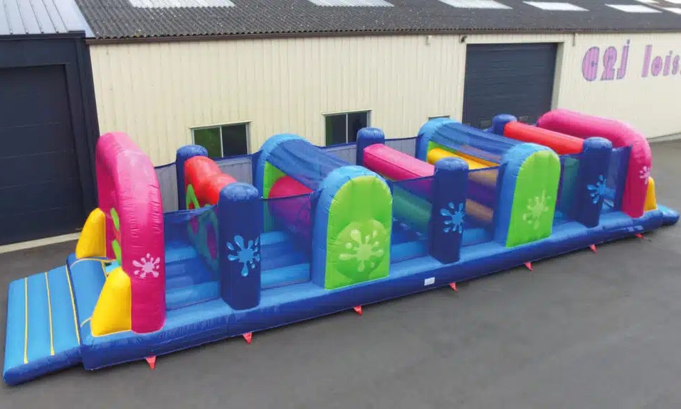Le jeu commence par l’obstacle “Trou de souris” le but est de passer par un des 2 trous minuscules. Une fois passés, les enfants doivent franchir une poutre gonflable, puis passer à travers le “Laminoir gonflable”, un obstacle avec des poutres à traverser mais attention à l’énorme poutre qui va gêner le passage. Ensuite ils passeront l’obstacle “Araignée”, suivi par le classique mur à 2 trous à passer le plus vite possible, et enfin l’obstacle “Grimpette à sangles”, c’est une énorme poutre sur lequel nous avons cousu 2 toiles avec des sangles pour grimper par dessus le boudin gonflable, avant d’arriver face aux “Punching-Balls”.