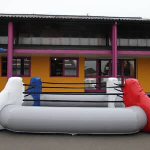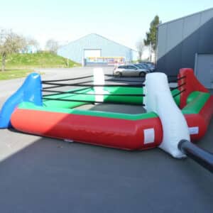 Ce ring de boxe est idéal pour la découverte ou l’initiation à la boxe avec sa taille de 5x5m. Facile à installer (branché et c’est gonflé !) il ne prend pas beaucoup de place et ses 50kg en font une animation facile à manutentionner et à transporter. Enfilez les énormes gants de boxe et pénétrez sur le ring gonflable. Pour un rendu plus réaliste nous avons fait le choix de mettre des sangles noires sur les côtés.