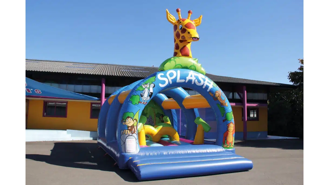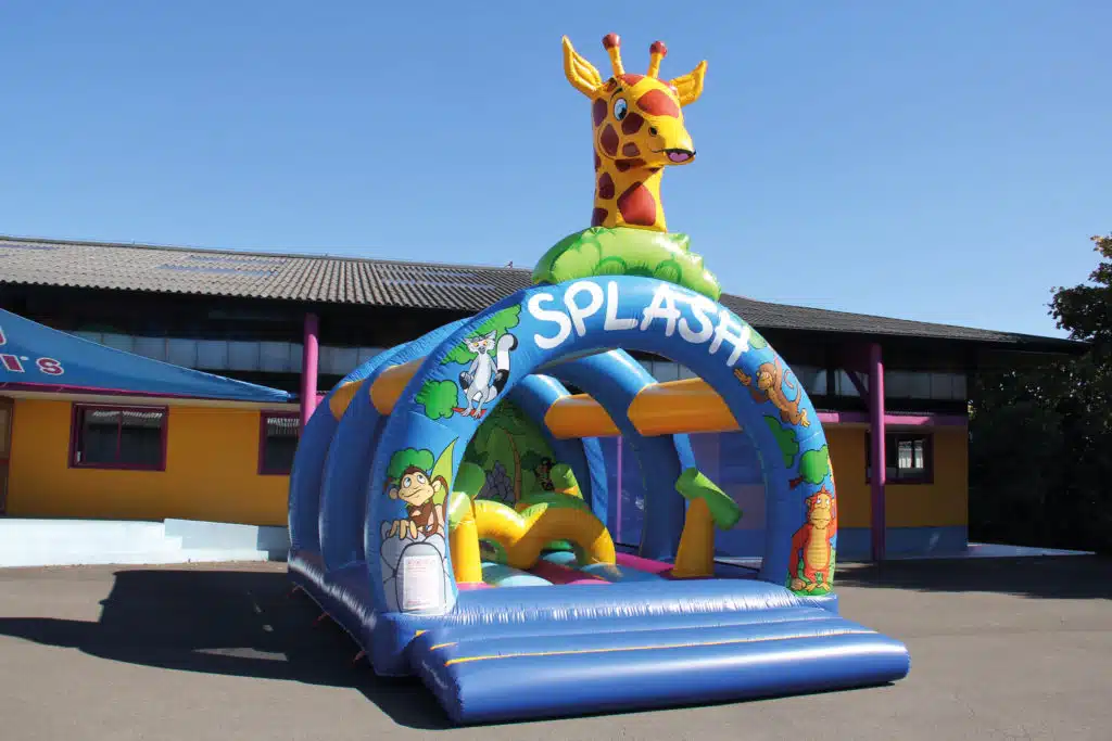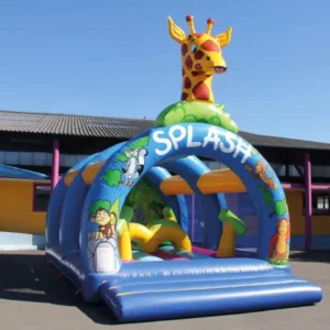 Le Splash sous 3 arches est un matelas à sauter avec 4 canons à eau, 1 pont avec une buse qui arrose les enfants quand ils passent dessous et une boule obstacle d’où sortent des jets d’eau. Ce jeu peut accueillir 25 enfants en même temps. Sur les côtés on trouve les filets pour sécuriser l’aire de jeu, ils ont la particularité de laisser passer la lumière, ce qui permet de voir à travers, très pratique pour surveiller les enfants. Au fond est cousu une jolie toile tendue avec une déco Splash peinte à la main.