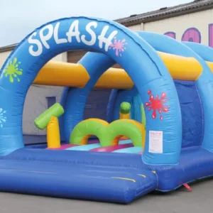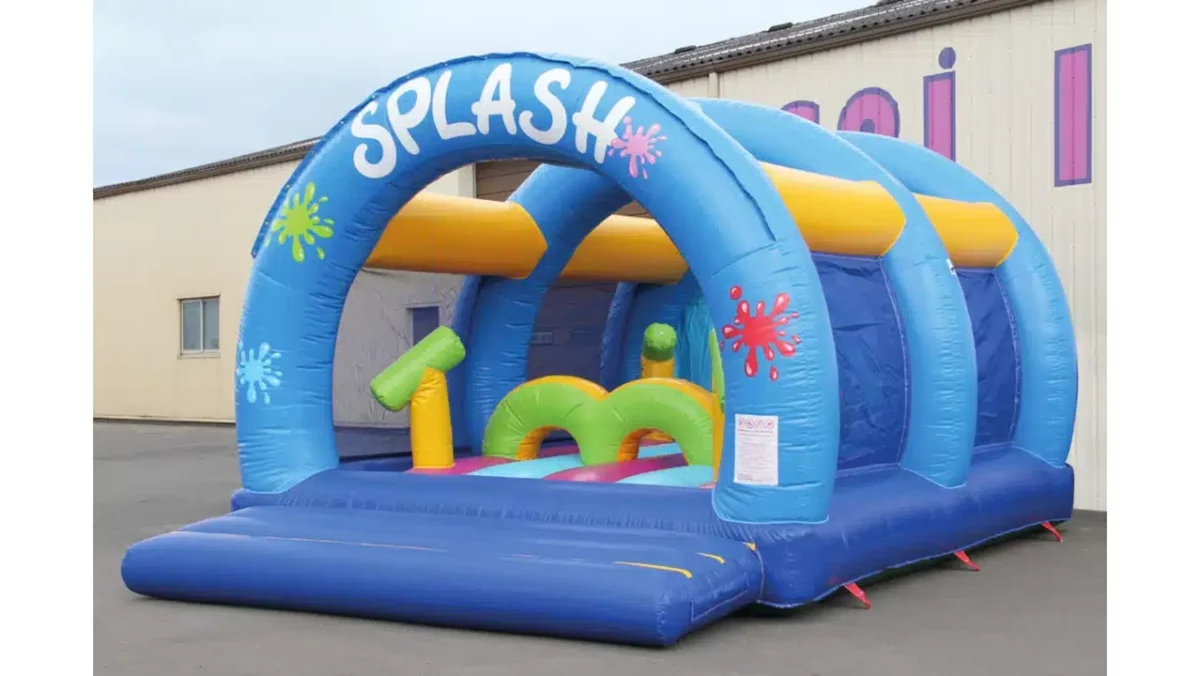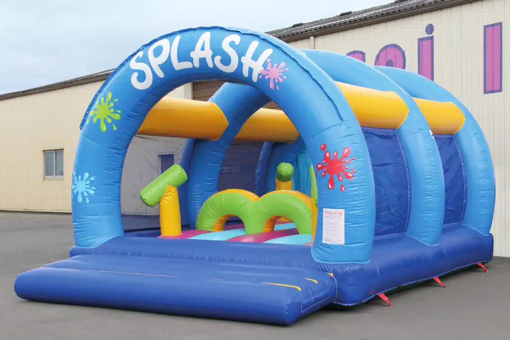 Le Splash sous 3 arches est un matelas à sauter avec 4 canons à eau, 1 pont avec une buse qui arrose les enfants quand ils passent dessous et une boule obstacle qui fait des jets d’eau. Ce jeu peut accueillir 25 enfants en même temps. Sur les côtés on trouve les filets pour sécuriser l’aire de jeu, ils ont la particularité de laisser passer la lumière. Ce qui permet de voir à travers, très pratique pour voir les enfants. Au fond est cousu une jolie toile tendue avec une déco Splash peinte à la main.