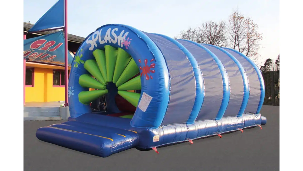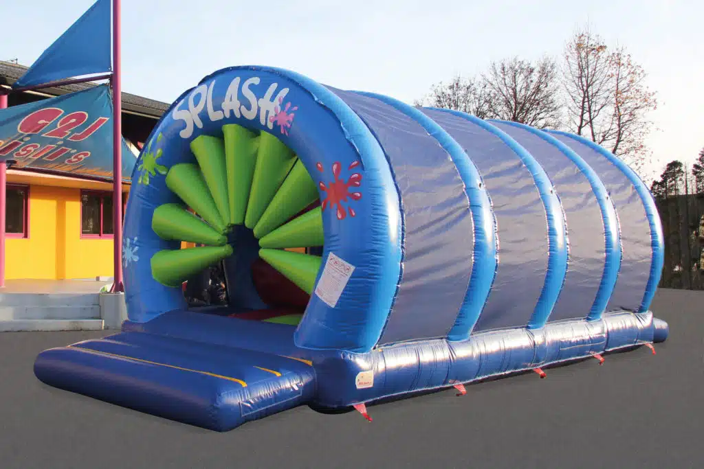 Le parcours sous 5 arches est composé d’obstacles u niveau de chaque arche. Le jeu débute par une entrée avec un tout nouvel obstacle, 9 cônes gonflables qui gênent l’entrée, suivi de 2 poutres, vient ensuite la croix gonflable qui barre la route, on trouve après la balançoire et pour finir la toile d’araignée. Sur les côtés on trouve les filets pour sécuriser l’aire de jeu, ils ont la particularité de laisser passer la lumière, ce qui permet de voir à travers, très pratique pour voir les enfants.