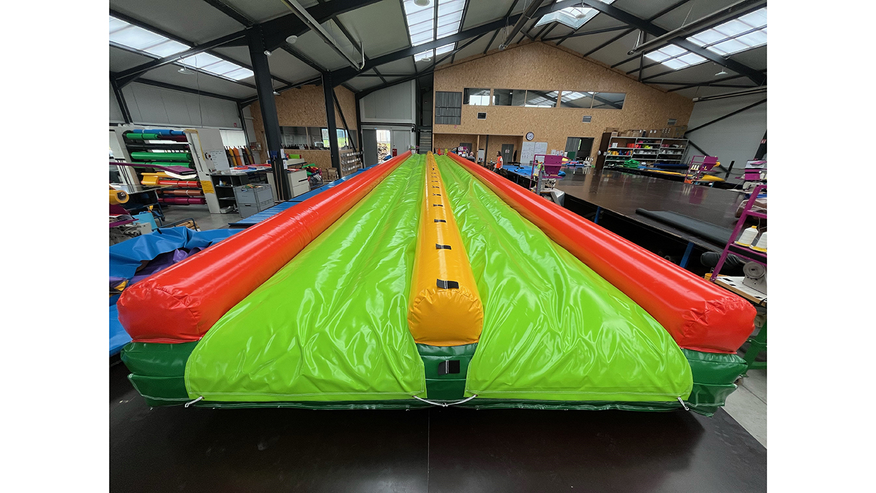 Pour arroser la glisse nous avons fixé un tuyau d’eau micro-perforé sur le boudin central qui arrose chaque piste. Vous pouvez choisir les couleurs du jeu lors de votre commande.