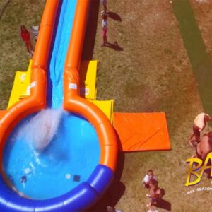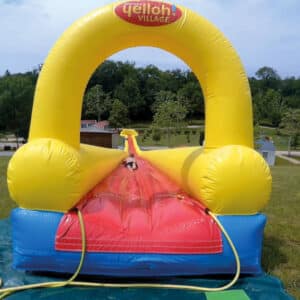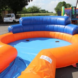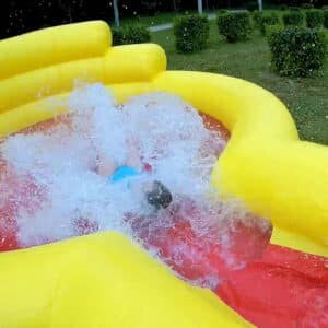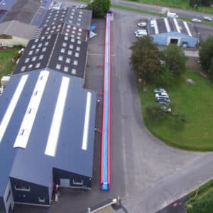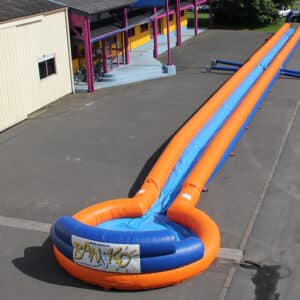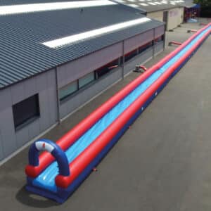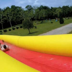 Pour que l’utilisateur ne s’arrête pas en milieu de glisse il est nécessaire d’avoir une pente de 20% minimum. De chaque côté de la glisse nous avons cousu sur le matelas des boudins pour protéger les utilisateurs. A la fin de la glisse l’utilisateur fini dans une aire d’arrivée de Ø4.7m. Raccorder les modules de 20m pour composer un super glissade + à votre longueur.