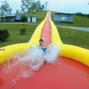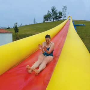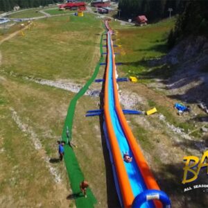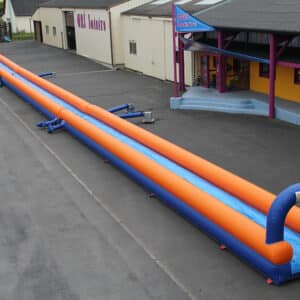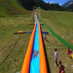 Le Super Glissade + c’est une longue glisse aquatique de 25m jusqu’à plusieurs centaines de mètres sur un matelas gonflable. L’eau est envoyée depuis le haut de la piste (1er module), la toile de glisse est alors rendue très glissante, il ne reste plus qu’à se lancer.
