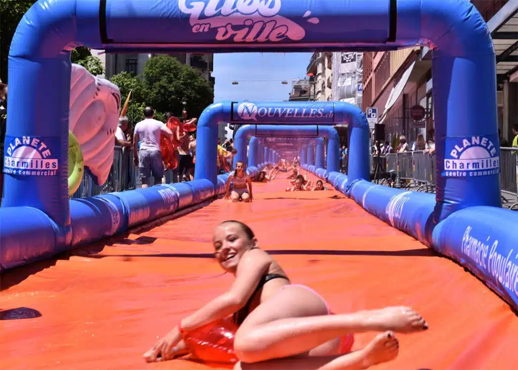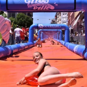 Le Surf’in the street c’est une très longue glisse aquatique de plusieurs centaines de mètres sur de la bâche mouillée. L’eau est envoyée par les arches (tuyau sous chaque arche), ce qui rend la toile de glisse très glissante, il ne reste plus qu’à se lancer. Pour que l’utilisateur ne s’arrête pas en milieu de glisse il est nécessaire d’avoir une pente de 10% minimum. De chaque côté de la glisse nous avons cousu sur le matelas des boudins pour protéger les utilisateurs. A la fin de la glisse l’utilisateur fini dans une aire d’arrivée de Ø6.5m. Raccorder les modules de 30m pour composer un super glissade + à votre longueur.