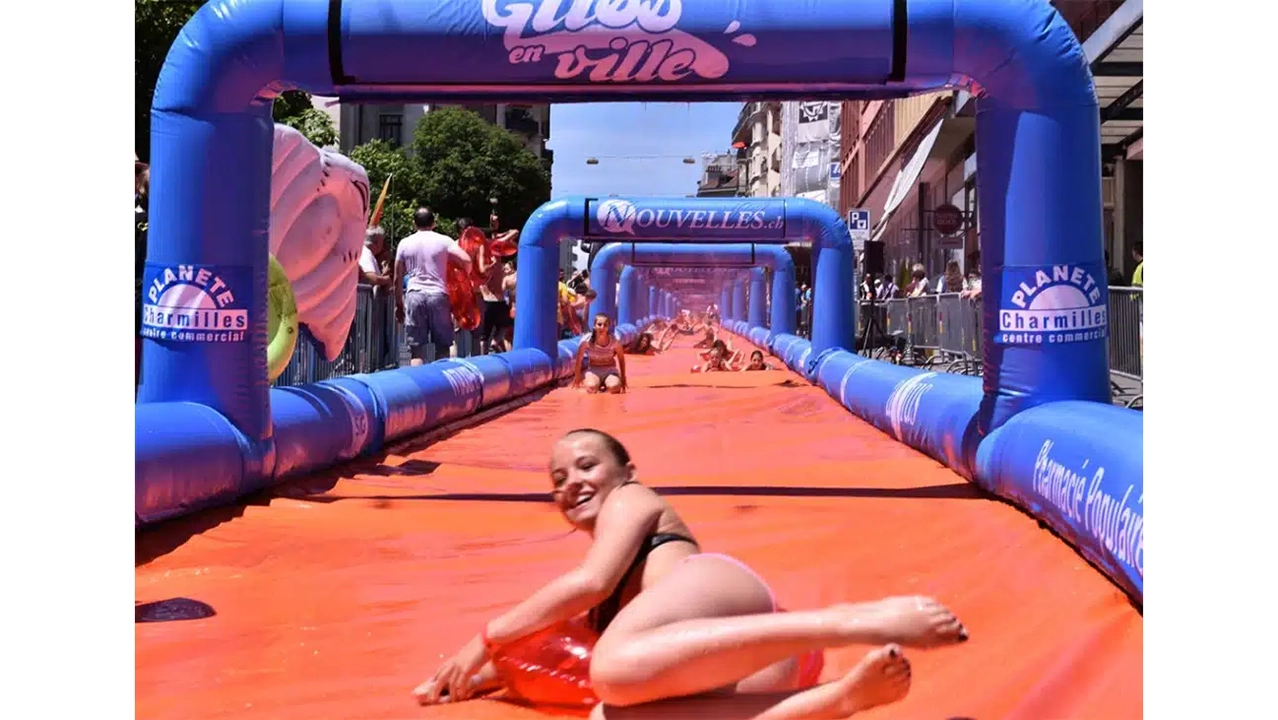 Le Surf’in the street c’est une très longue glisse aquatique de plusieurs centaines de mètres sur de la bâche mouillée. L’eau est envoyée par les arches (tuyau sous chaque arche), ce qui rend la toile de glisse très glissante, il ne reste plus qu’à se lancer. Pour que l’utilisateur ne s’arrête pas en milieu de glisse il est nécessaire d’avoir une pente de 10% minimum. De chaque côté de la glisse nous avons cousu sur le matelas des boudins pour protéger les utilisateurs. A la fin de la glisse l’utilisateur fini dans une aire d’arrivée de Ø6.5m. Raccorder les modules de 30m pour composer un super glissade + à votre longueur.