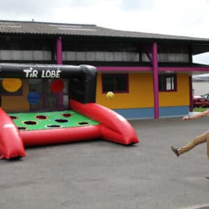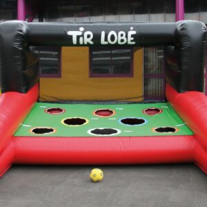 Le tir au but lobé est un jeu gonflable d’animation thématisé football. Le jeu comprend une toile de tir au but horizontale & des cibles sur un filet. Le joueur se place devant le jeu et en faisait preuve de précision il peut soit tirer dans les cibles pour travailler sa précision, soit s’entrainer aux lobs. En fonction de ses buts les trous donnent plus ou moins de points Le but du jeu est de marquer le plus de points possible et un minimum de coup. Un jeu très apprécié des ligues de foot et des associations sportives. Vous pouvez choisir les couleurs de votre Tir lobé pour qu’ils ressemblent le plus aux couleurs de votre club.