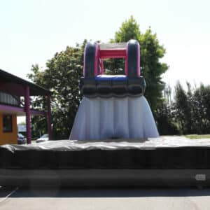 Le X-Jump est une animation à forte sensation, le jeu est un ensemble de 2 modules. Le 1er module permet au joueur de monter à 4m pour faire son saut. Pour aider le joueur dans sa montée nous avons cousu des grandes marches antidérapantes sur la toile de grimpette, sur le côté de la grimpette des petites sangles sont cousues dans l’épaisseur du mur pour aider pendant la montée.