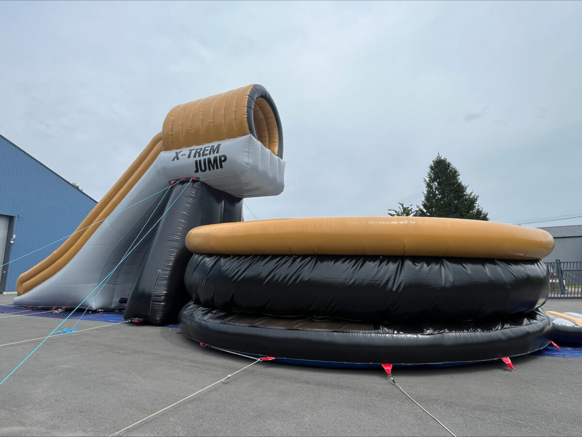 Pour aider le joueur dans sa montée nous avons cousu des grandes marches antidérapantes sur la toile de grimpette, sur le côté de la grimpette des petites sangles sont cousues dans l’épaisseur du mur pour aider pendant la montée. Le second module “Airbag” d’un diamètre de Ø10m, réceptionnera ceux qui n’ont pas froid aux yeux. Notre airbag est particulier puisqu’il n’a pas besoin d’être réglé, une fois mis en place et gonflé il est prêt à recevoir les 1ers sauts. L’airbag est entouré par un muret gonflé pour guider les participants vers la sortie de l’airbag. Une fois l’utilisateur sorti de l’airbag, il suffit juste d’attendre que celui-ci reprenne sa forme pour effectuer un nouveau saut.